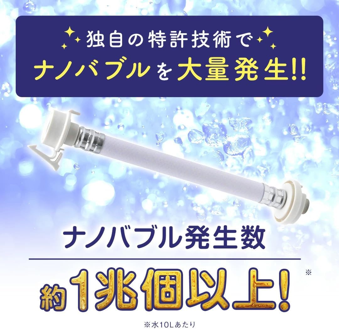 最大の強みは、ホース内に「たまたま残っている空気」を分解して泡を作るタイプではなく、特殊エジェクター方式で外部から空気を取り込みながら、安定して大量のナノバブルを生成できる点です。空気量に左右されにくいので、泡の発生がブレにくく、洗い上がりの期待値が安定しやすいのが魅力。
