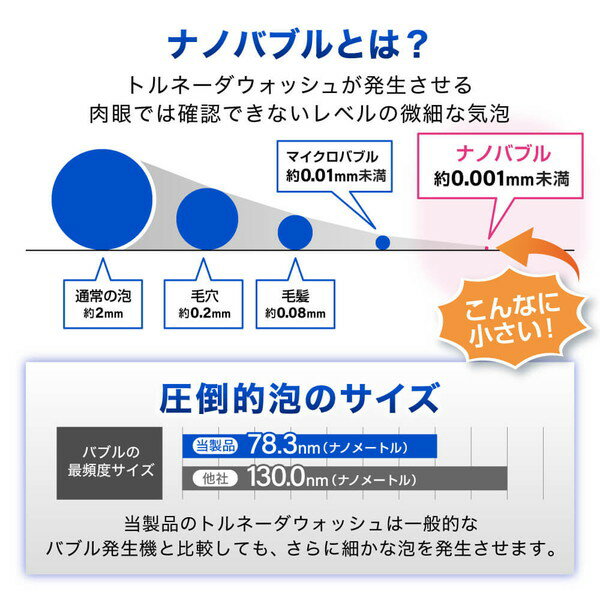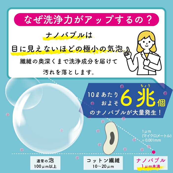 メーカー資料では、直径約0.0001mmのナノバブルが、洗濯1回あたり約6,700億個(平均使用水量100L想定)発生すると明示。汚れやニオイのもとに泡が吸着し、洗い流します。