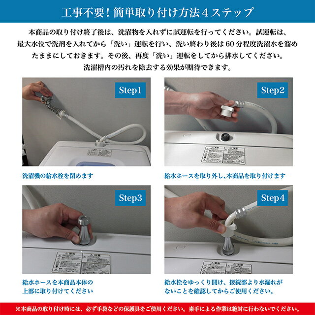 さらに、洗濯槽の変化例(5年使用→2カ月)や、水だけでの汚れ落ち例も掲載されています。本体は黄銅(シルバーメッキ)で、耐熱は60℃です。