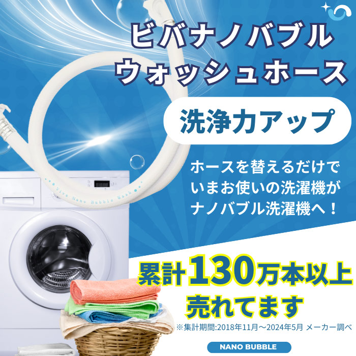 Viva(ビバ)ナノバブルウォッシュホースは、洗濯機の給水ホースを“丸ごと交換”して使うタイプです。ホース内蔵の発生器でトルネード水流を起こし、1Lあたり約6,000億個以上のナノバブルが発生すると案内されています。ホース長は1m、使用温度は1〜50℃、製造は中国です。